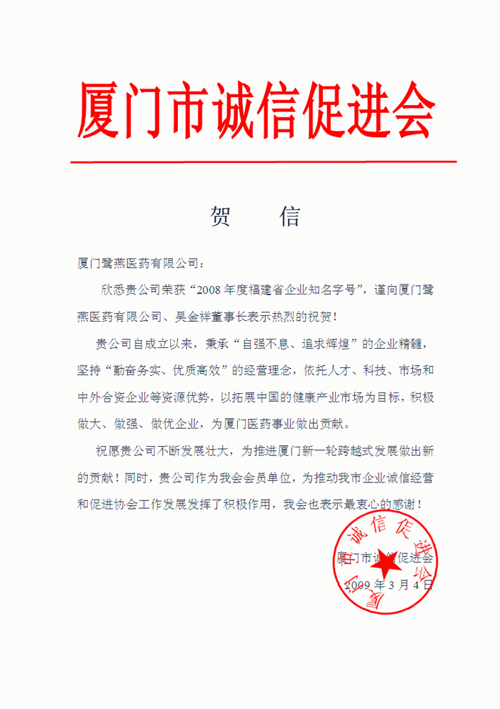 廈門(mén)市誠(chéng)信促進(jìn)會(huì)賀信