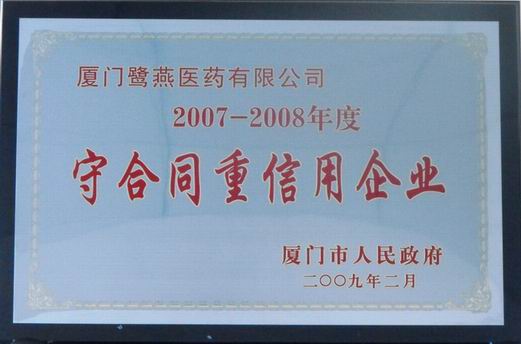 近日,廈門鷺燕醫(yī)藥有限公司、廈門鷺燕大藥房有限公司在廈門市工商行政管理局組織的 “廈門市2007—2008年度‘守合同,重信用’”評比活動中榜上有名,這是鷺燕集團旗下子公司繼05-06年度之后再次獲此殊榮。
