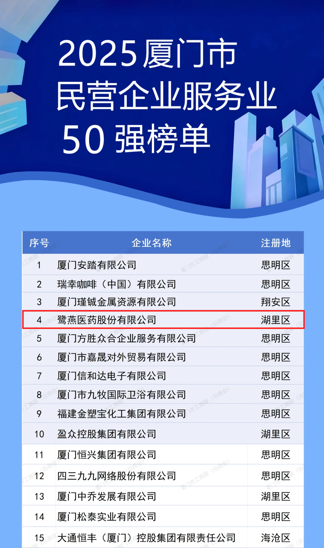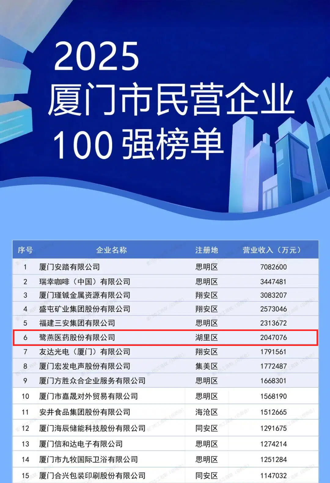 11月1日上午,2025年廈門企業(yè)家日大會召開。大會發(fā)布了2025廈門市民營企業(yè)100強系列榜單,介紹了廈門市民營經(jīng)濟發(fā)展態(tài)勢和營商環(huán)境建設成效。鷺燕醫(yī)藥股份有限公司憑借上市企業(yè)綜合實力,榮膺“2025廈門市民營企業(yè)100強”第6位,以及“2025廈門市民營企業(yè)服務業(yè)50強”第4位。