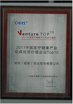 2011年7月14日,在北京舉辦的2011第五屆中國醫(yī)療健康產(chǎn)業(yè)投融資峰會(huì)上,鷺燕(福建)藥業(yè)股份有限公司榮獲“2011中國醫(yī)療健康產(chǎn)業(yè)最具投資價(jià)值企業(yè)TOP10”稱號(hào)。公司于2010年引進(jìn)建銀國際醫(yī)療產(chǎn)業(yè)基金等投資者近1.5億元投資后,在公司治理、經(jīng)營業(yè)績、戰(zhàn)略布局等方面得到進(jìn)一步提升,鞏固了公司在福建省醫(yī)藥流通領(lǐng)域的龍頭地位。
