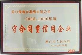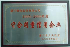 經(jīng)過(guò)層層選拔、評(píng)審,廈門(mén)鷺燕醫(yī)藥有限公司和廈門(mén)鷺燕大藥房有限公司雙雙榮獲了“2005-2006年度守合同重信用企業(yè)”稱(chēng)號(hào),這是政府權(quán)威部門(mén)對(duì)我集團(tuán)合同管理工作的充分肯定。
